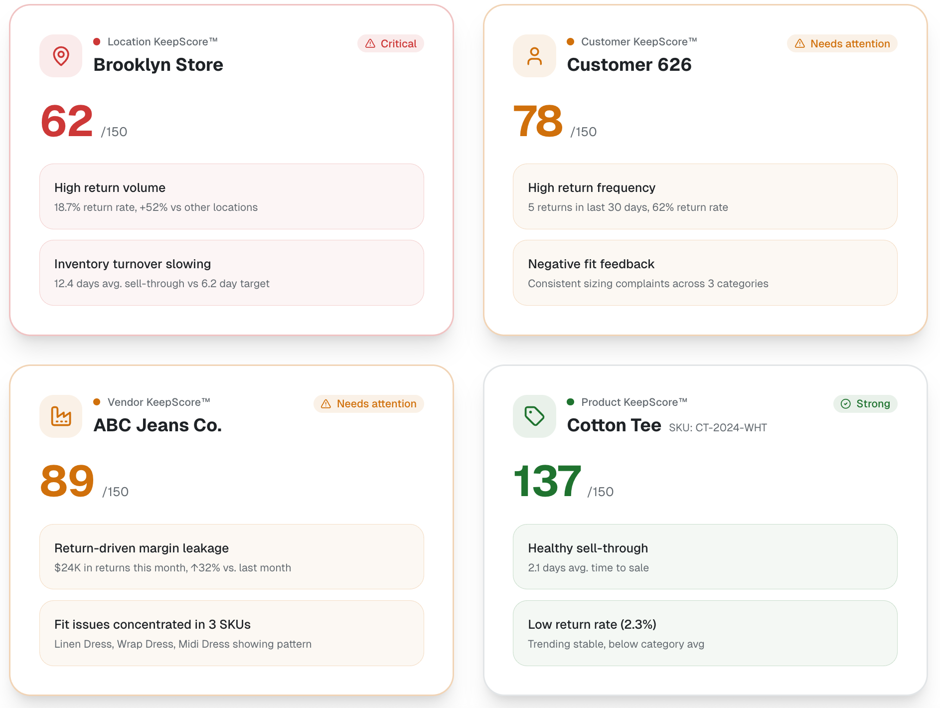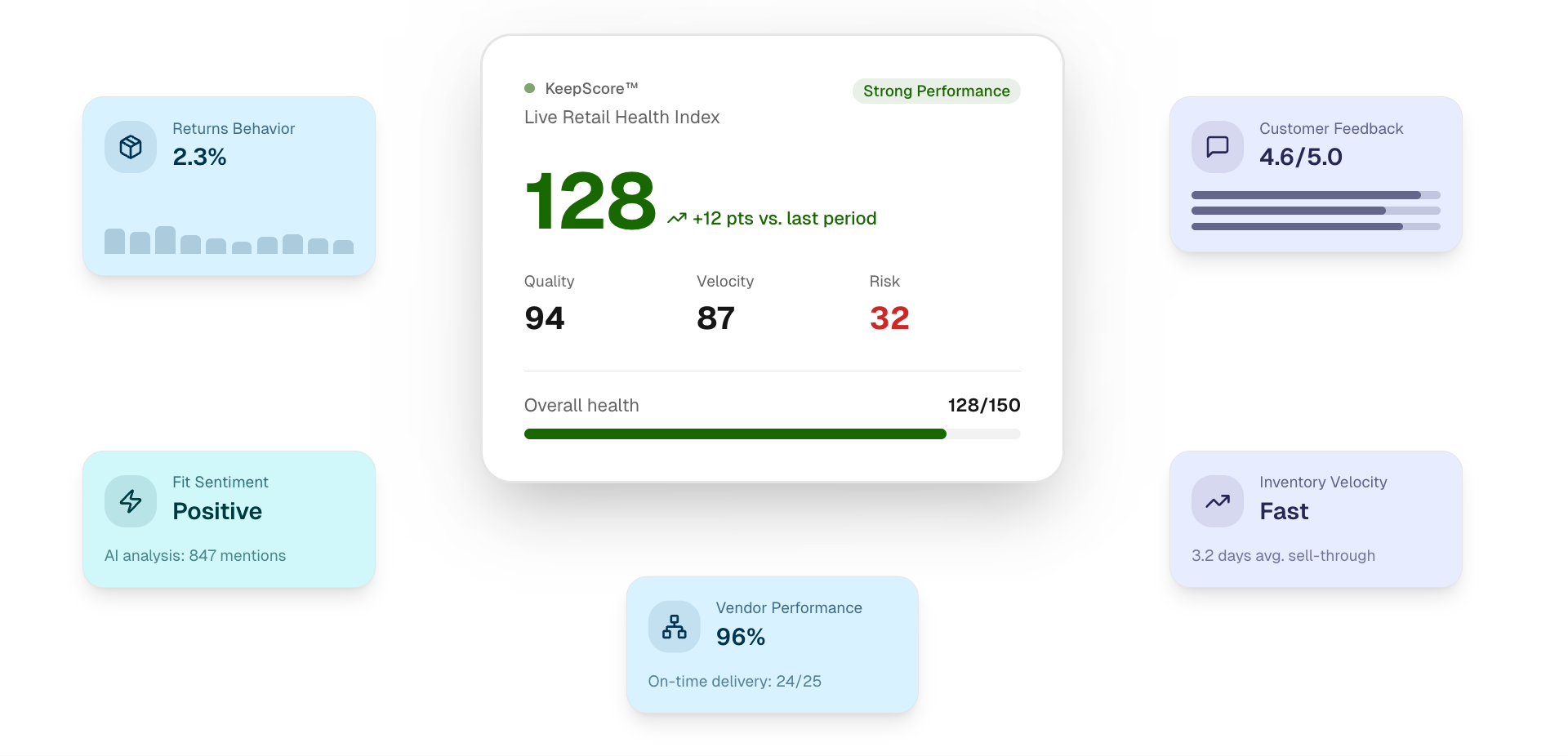 Instead of scanning dashboards or chasing individual metrics, KeepScore synthesizes all of your data into a single, retail-native indicator of health.